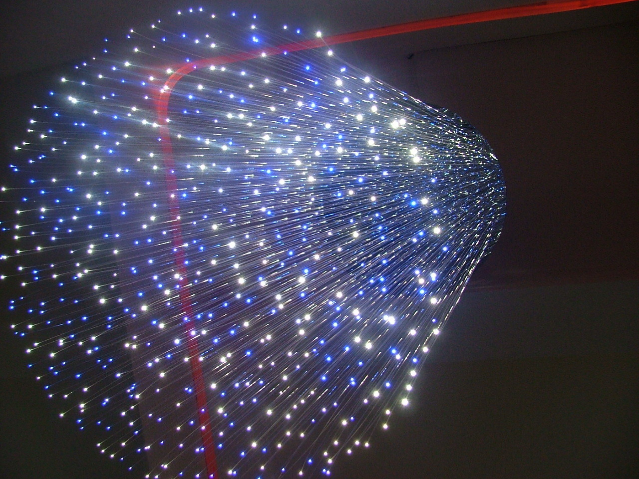 光纖燈照明系統(tǒng)是由光源、反光鏡、濾色片及光纖組成。 LED光纖照明可以創(chuàng)造出許多絢爛多彩的效果,如:水晶星空星座、十二星座、流星雨、星空風(fēng)瀑、流水瀑布、光纖幕墻、垂簾、三維立體鏡畫等等效果,絢麗多彩、色彩柔和、如夢如幻、精美典雅,是藝術(shù)與生活的完美結(jié)合,廣泛應(yīng)用于星級(jí)酒店、酒吧、夜總會(huì)、KTV、迪廳、桑拿、洗浴中心等高檔娛樂場所。