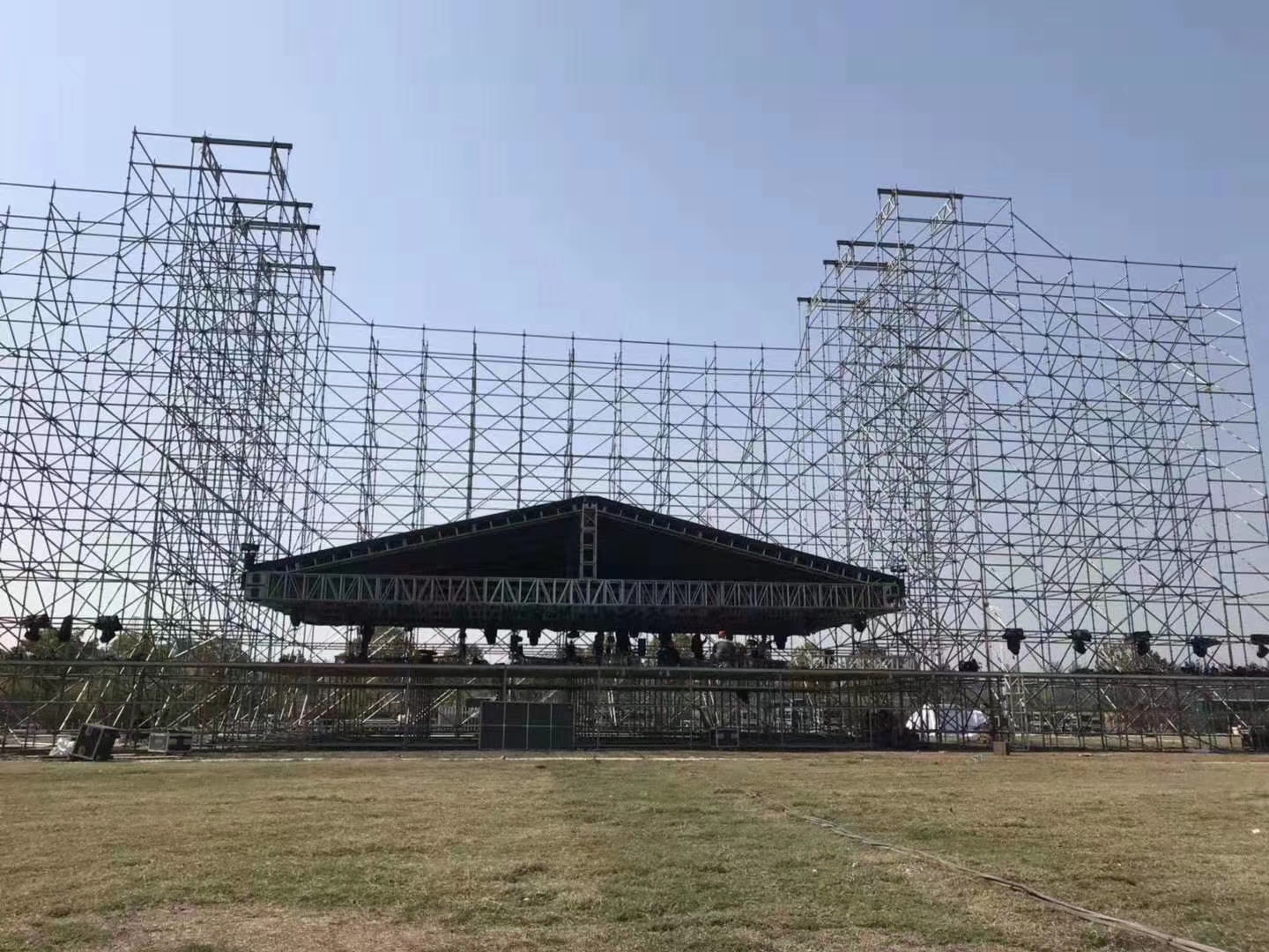 雷亞架主要用于大型演唱會(huì)的燈光架、背景架。支撐架分為立桿及橫桿、斜桿,圓盤上有八個(gè)孔,四個(gè)小孔為橫桿專用;四個(gè)大孔為斜桿專用。橫桿、斜桿的連接方式均為插銷式的,可以確保桿件與立桿牢固連結(jié)。橫桿、斜桿接頭特別依管的圓弧制造,與立桿鋼管呈整面接觸,敲緊插銷后,呈三點(diǎn)受力( 接頭上下二點(diǎn)及插銷對(duì)圓盤一點(diǎn))可牢牢固定增加結(jié)構(gòu)強(qiáng)度并傳遞水平力,橫桿頭與鋼管身采用滿焊固定,力量傳遞無誤。而斜桿頭為可轉(zhuǎn)動(dòng)接頭,以鉚釘將斜桿頭與鋼管身固定。至于立桿的連接方式是以四方管連接棒為主,而連接棒已固定在立桿上,不用另外的接頭組件來組合,可省卻材料遺失及整理的麻煩。